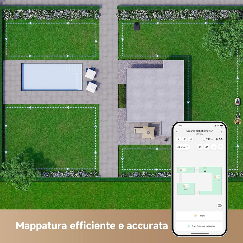 DREAME A1 PRO ROBOT TAGLIAERBA, SENZA FILO PERIMETRALE, CONTROLLO TRAMITE APP, TECNOLOGIA OMNISENSE™, GESTIONE INTUITIVA DELLE ZONE, EVITAMENTO INTELLIGENTE DEGLI OSTACOLI